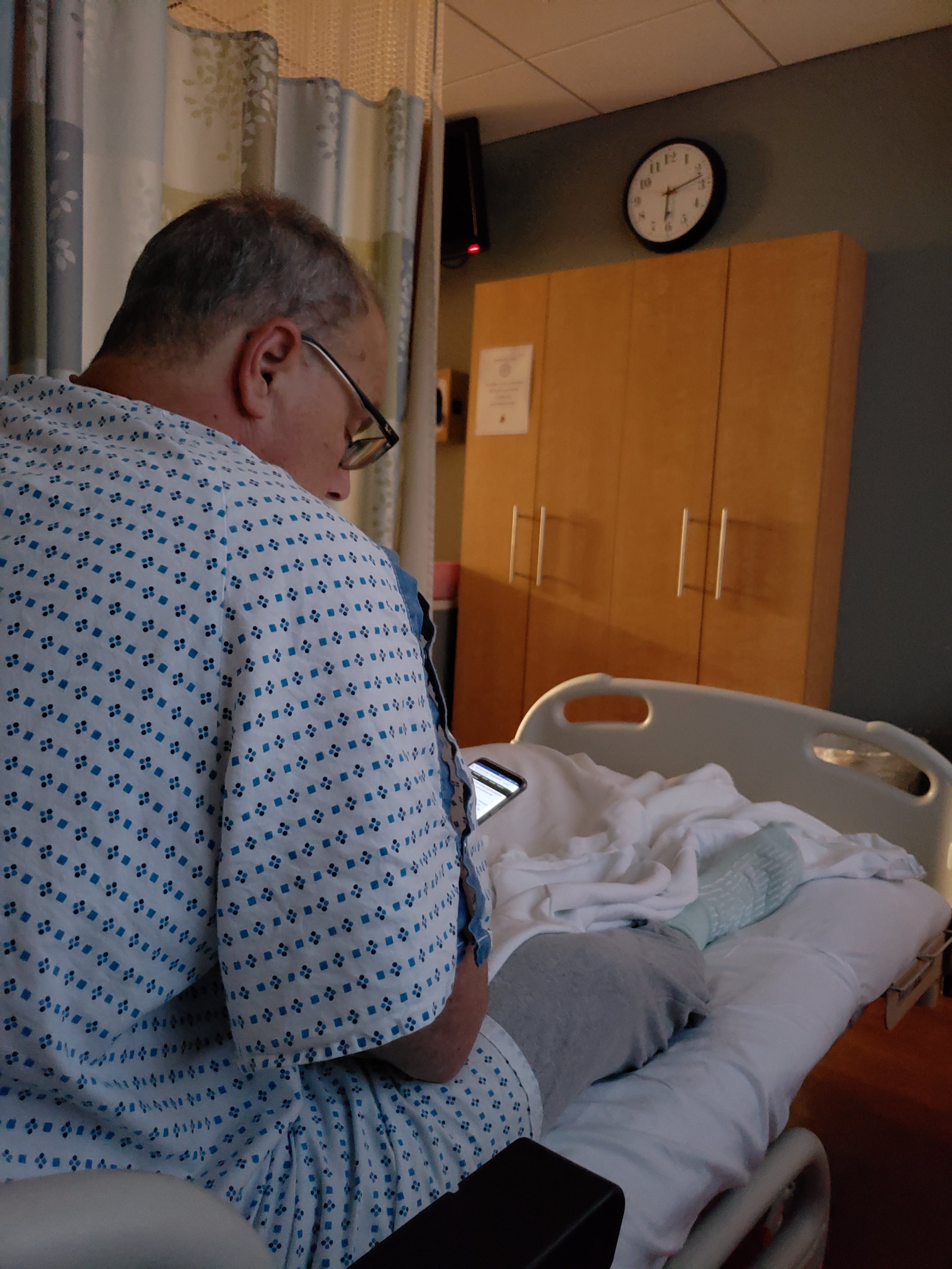 Blood work and vitals taken… history told over and over again. And then the waiting began. The plan is to be monitored and data gathered on what his heart was up to. To see how the electrical pulses that make the heart beat are doing. Rich feels none of the changes. The day drags. We’re admitted to a room for the night… monitors and AED pads stuck all over Rich.